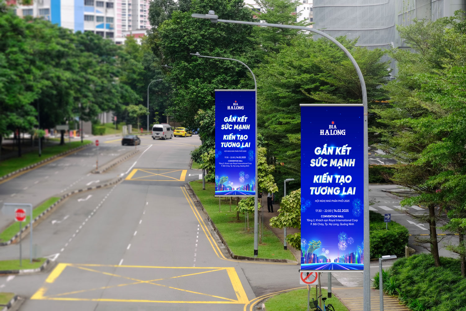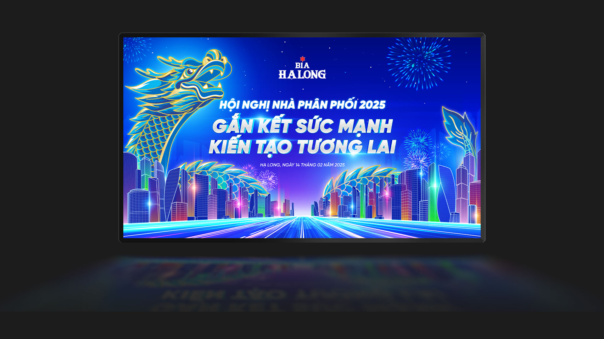 The dragon, a nod to Vietnamese heritage, intertwines with dynamic light trails, representing the connection between tradition and innovation. This bold composition, paired with the Halong Beer logo, enhances the event’s theme of success and sets an inspiring tone for the occasion.