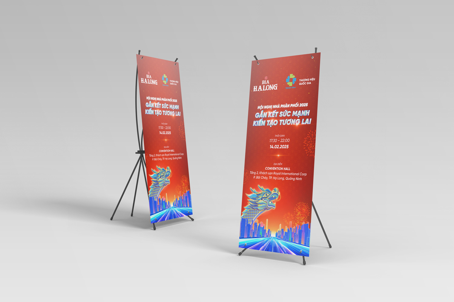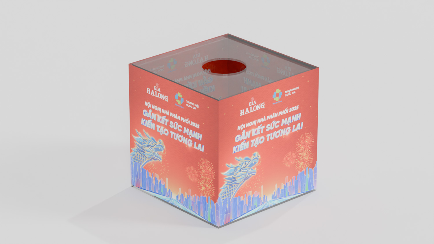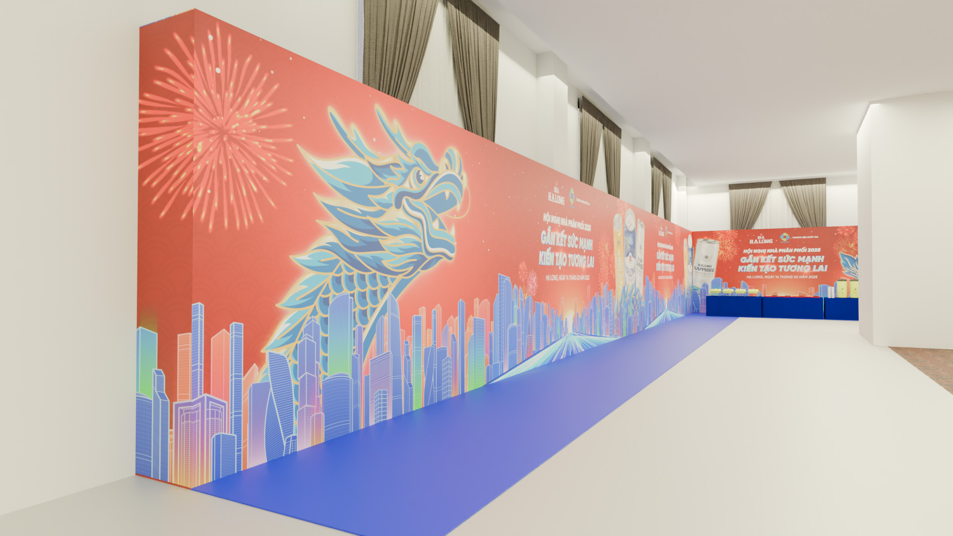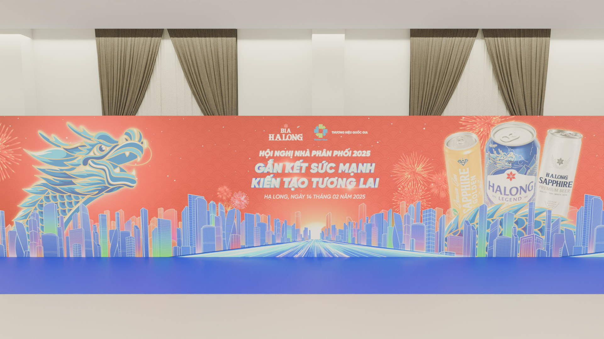 The dragon, a nod to Vietnamese heritage, intertwines with dynamic light trails, representing the connection between tradition and innovation. This bold composition, paired with the Halong Beer logo, enhances the event’s theme of success and sets an inspiring tone for the occasion.